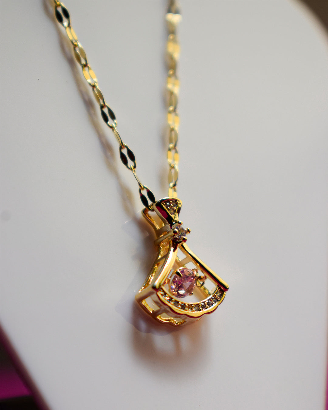 Bring a touch of glamour to your outfit with this elegant gold-tone pendant necklace. Featuring a unique dress-shaped pendant adorned with shimmering cubic zirconia accents and a central pink crystal, it offers a perfect blend of charm and sophistication. Crafted from high-quality imitation jewelry materials, this piece provides a luxurious look at an affordable price. Ideal for special occasions or as a thoughtful gift, it’s sure to become a favorite in your collection.