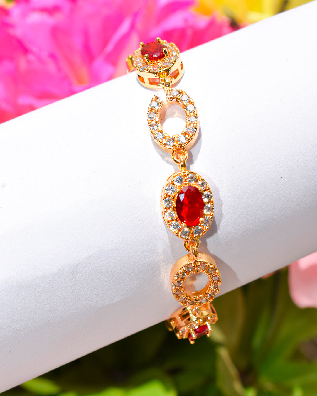 Enhance your style with this Elegant Ruby Red Stone Bracelet, crafted from high-quality artificial materials for a luxurious look without the heavy price tag. Featuring oval-cut ruby red centerpiece stones encircled by sparkling Cubic Zirconia crystals, this bracelet offers the perfect blend of glamour and comfort.