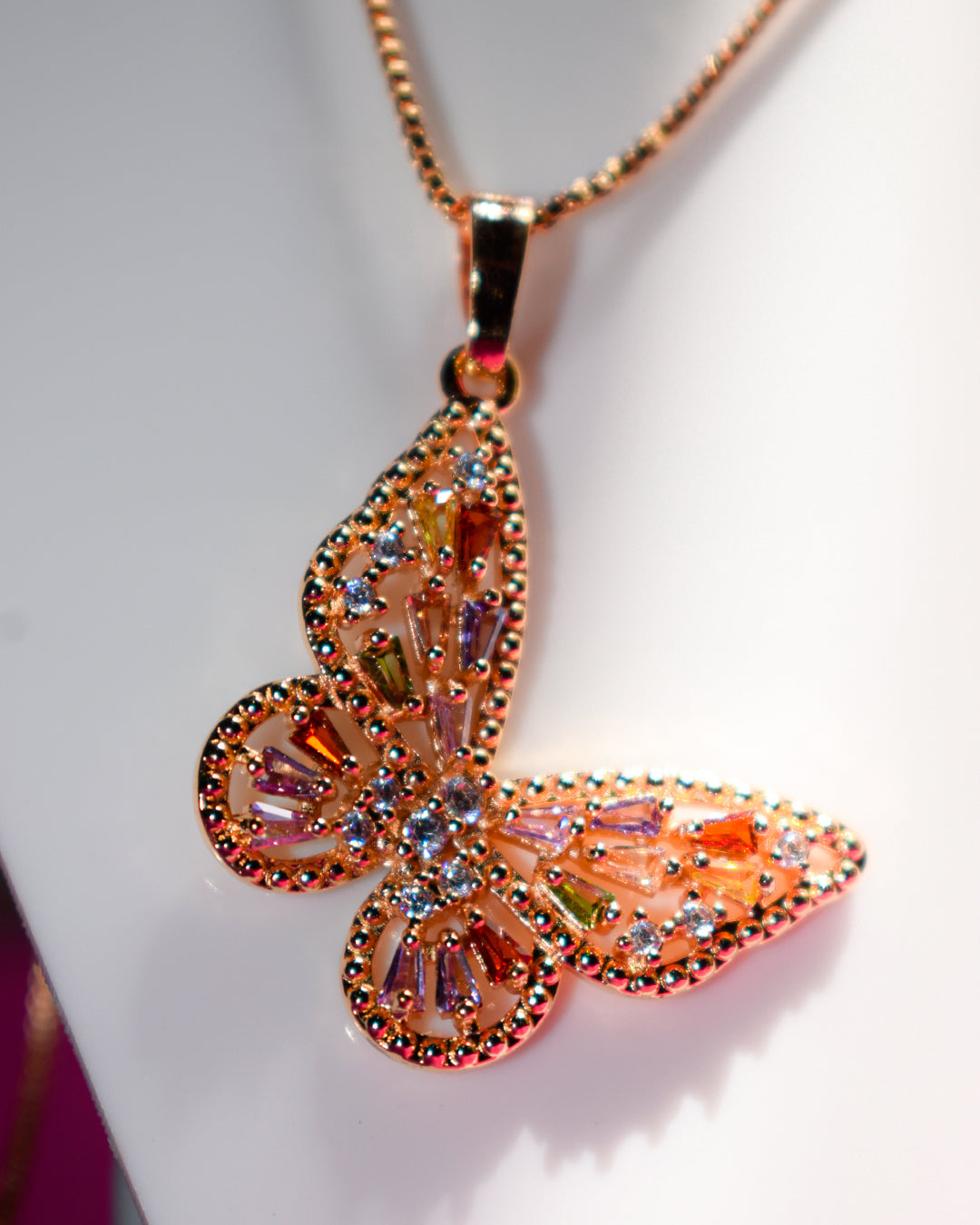 Gold-Tone Butterfly Pendant Necklace with Multicolor Crystals – Imitation Jewelry
