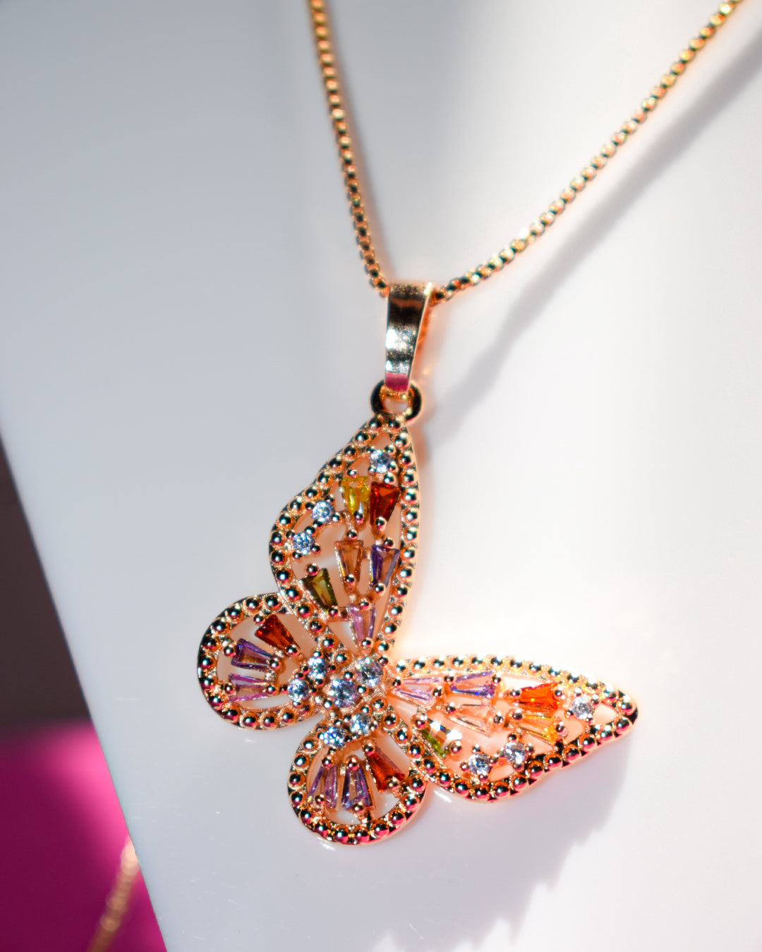 Add a vibrant sparkle to your style with this stunning gold-tone butterfly pendant necklace. The butterfly is beautifully encrusted with multicolor crystals in orange, pink, green, and white hues, creating a dazzling and eye-catching look. Made with premium imitation jewelry materials, this necklace is lightweight, durable, and perfect for everyday elegance or special occasions. A must-have accessory for anyone who loves playful yet classy jewelry.