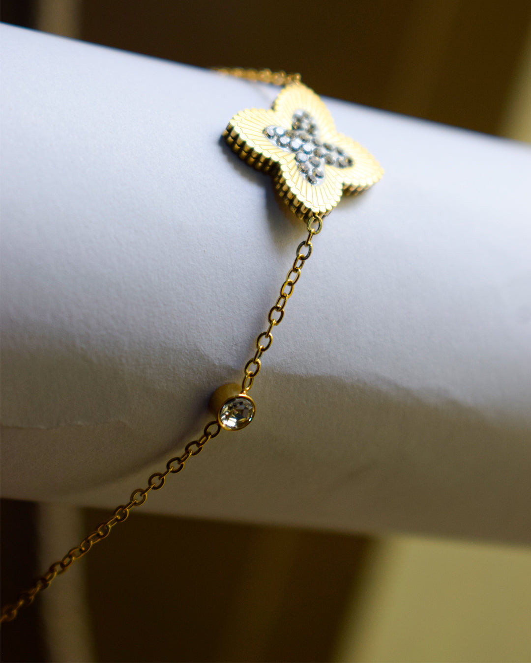 Gold-tone finish with crystal chain accent
