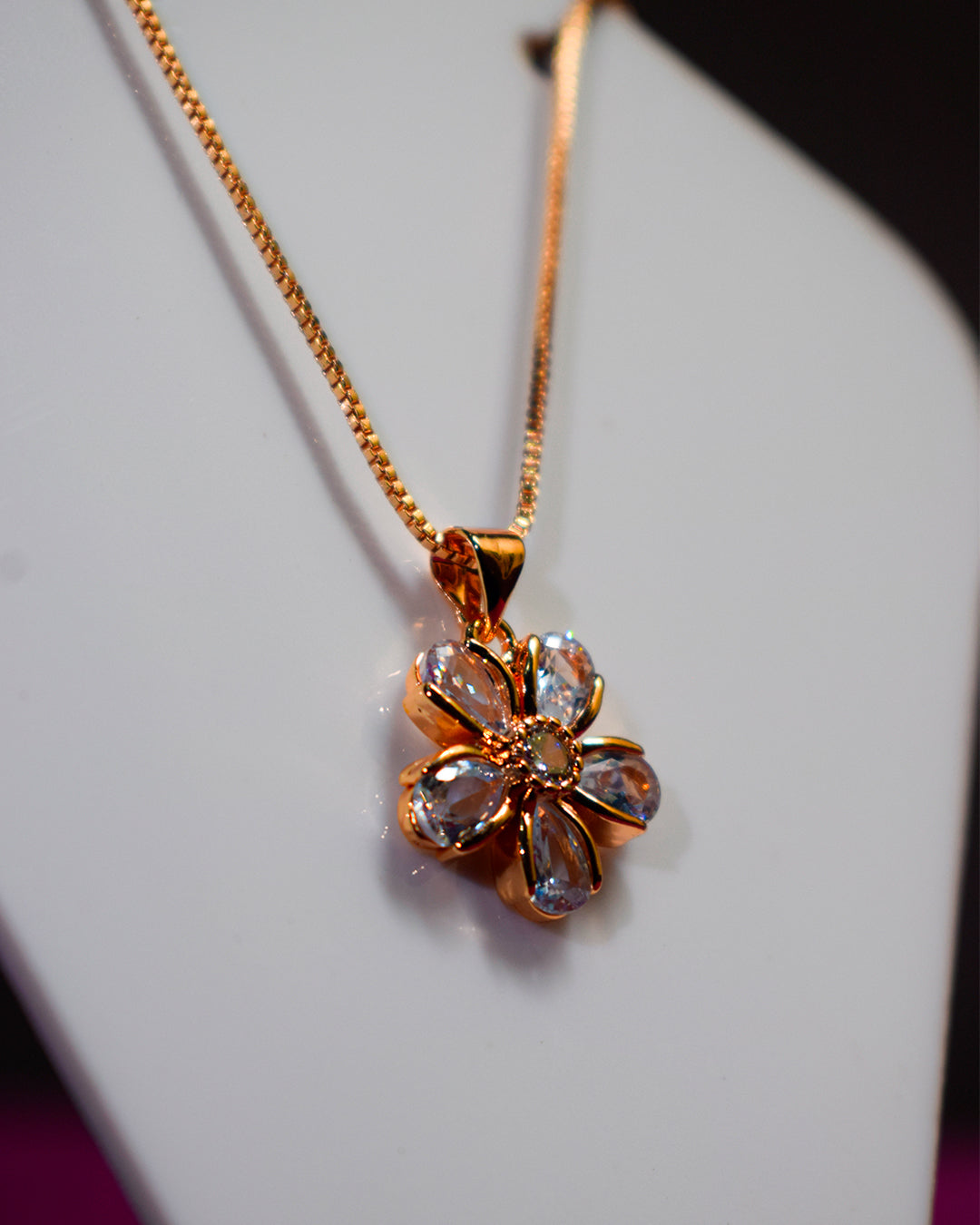 Bring a delicate sparkle to your look with this elegant gold-tone flower pendant necklace. The pendant features a beautiful floral design adorned with six teardrop-shaped clear crystals, creating a radiant shine with every movement. Made from high-quality imitation jewelry materials, it combines timeless charm with everyday wearability. Perfect for gifting or adding a touch of elegance to your outfit.